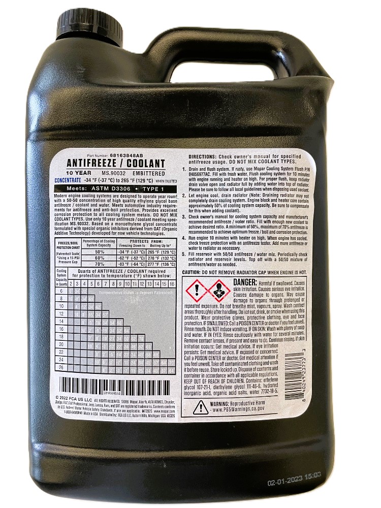 Mopar chladící kapalina - koncentrát !!! Při smíchácní v poměru 50/50 lze použít do -37 Celsia viz tabulka ilustrace..číst více